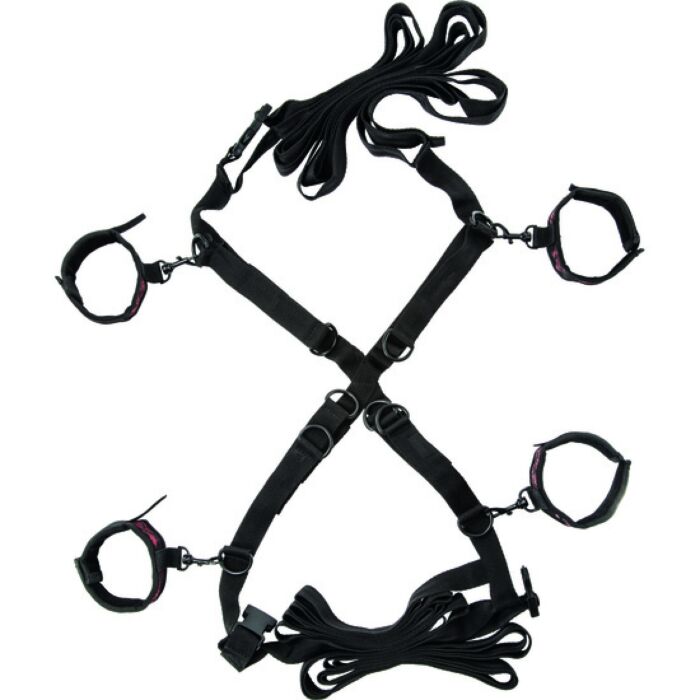 OVER THE BED CROSS An elegant set of bed restraints with handcuffs for wrists and ankles to enjoy the most fantastic experiences to the fullest. -Adjustable and adaptable to mattresses up to 1.93 m wide x 2.03 m long. -The co