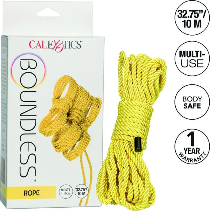 Δημιουργήστε ασφαλείς και άνετες δέσμες με την cuerda CalExotics Boundless 1000 cm. Η υφασμάτινη κατασκευή από 70% βαμβάκι και 30% πολυεστέρα προσφέρει άνεση κατά τη διάρκεια των παιχνιδιών BDSM. Ο φωτεινός κίτρινος χρωματισμός προσθέτει μια εντυπωσιακή αίσθηση στα παιχνίδια σας.