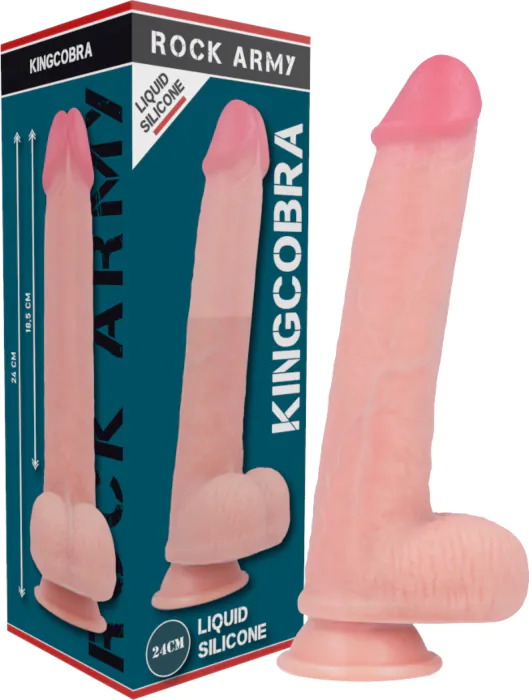 Ρεαλιστική και άνετη διείσδυση με τον δονητή Kingcobra της Rock Army, κατασκευασμένος από υποαλλεργική υγρή σιλικόνη. Με μήκος 24 εκ. και διάμετρο 4.77 εκ., ο εργονομικός του σχεδιασμός και η βάση με βεντούζα προσφέρουν τη δυνατότητα χρήσης χωρίς χέρια σε οποιαδήποτε επίπεδη επιφάνεια.