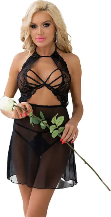 Αναδείξτε τη σιλουέτα σας με το σετ Malviami, που περιλαμβάνει μια σέξι μπλούζα από δαντέλα και ένα κομψό τanga. Το υλικό από πολυαμίνες και ελαστάνη αγκαλιάζει το σώμα χωρίς περιορισμούς, προσφέροντας άνεση και ελευθερία κινήσεων.