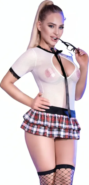 Αποκτήστε ακαταμάχητη αίσθηση με αυτό το κοστούμι σχολικής κοπέλας που συνδυάζει την αγνότητα με την πρόκληση. Ο μαλακός ύφασμα της μπάρας αναδεικνύει τις καμπύλες σας, ενώ η πλισέ φούστα με καρό σχέδιο προσθέτει μια παιχνιδιάρικη αίσθηση. Το σετ περιλαμβάνει αξεσουάρ όπως γυαλιά και κάλτσες, ολοκληρώνοντας την εμφάνιση.