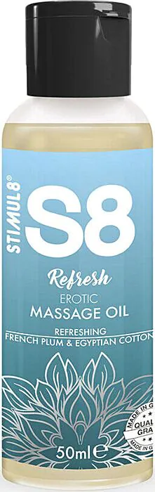Αναζωογόνηση και άνεση με το λάδι μασάζ STIMUL8 S8 Refresh. Η σύνθεσή του από έλαια jojoba, αμυγδάλου και σησαμιού προσφέρει θρεπτική αίσθηση και μακρόχρονη ολίσθηση. Η ελαφριά του αρωματική σύνθεση από γαλλική δαμάσκηνο και αιγυπτιακό βαμβάκι δημιουργεί μία ευχάριστη ατμόσφαιρα, ειδικά για εκείνους που προτιμούν απαλές, φρουτώδεις μυρωδιές.