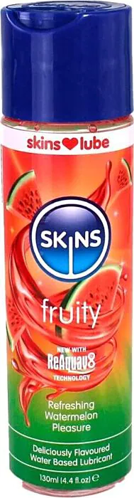 Ανακαλύψτε το λιπαντικό SKINS Fruity Sandía, με φυσική γεύση καρπούζι, ιδανικό για άνεση και ασφάλεια κατά τη διάρκεια του σεξ. Χωρίς ζάχαρη, είναι ασφαλές για χρήση με προφυλακτικά.