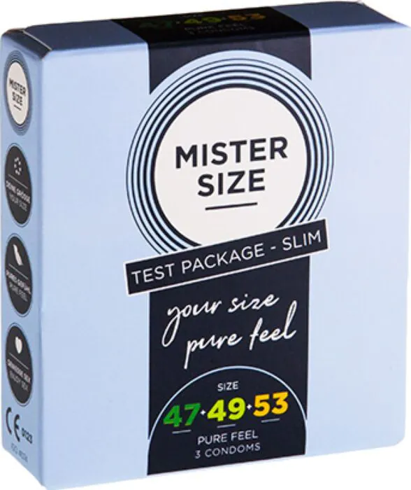 Ανακαλύψτε την άνεση και την αίσθηση της φυσικότητας με τα προφυλακτικά Mister Size. Με διαστάσεις 47, 49 και 53 χιλιοστά, αυτά τα προφυλακτικά από φυσικό καουτσούκ εξασφαλίζουν άριστη εφαρμογή και ασφάλεια. Με πάχος 0,05 χιλιοστά, επιτρέπουν μια πιο κοντινή επαφή απλά και αποτελεσματικά.