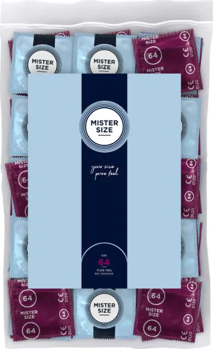 Τα προφυλακτικά MISTER SIZE 64 mm προσφέρουν άνετη και ασφαλή εφαρμογή. Το εξαιρετικά λεπτό πάχος τους επιτρέπει πιο έντονη αίσθηση κατά τη διάρκεια της επαφής.